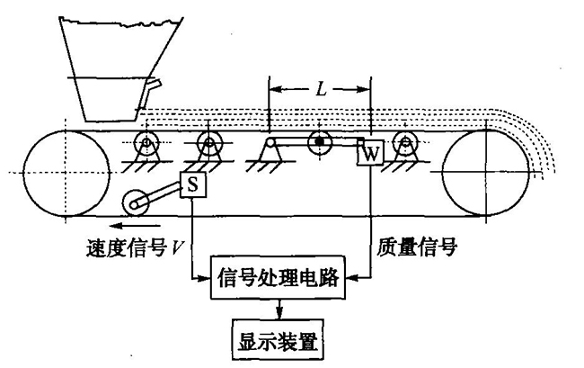 物料通過皮帶秤上方的皮帶時對皮帶有相對的壓力,壓力通過皮帶傳遞:托輯→秤架→稱重傳感器,稱重傳感器受力變化,其信號電壓mV信號也發生相應的變化,其變化值傳到儀表。物料通過皮帶的速度等于皮帶的速度,皮帶的運動帶動速度滾筒同速運轉,此時測速滾筒傳感器將測得的速度信號傳到儀表。
